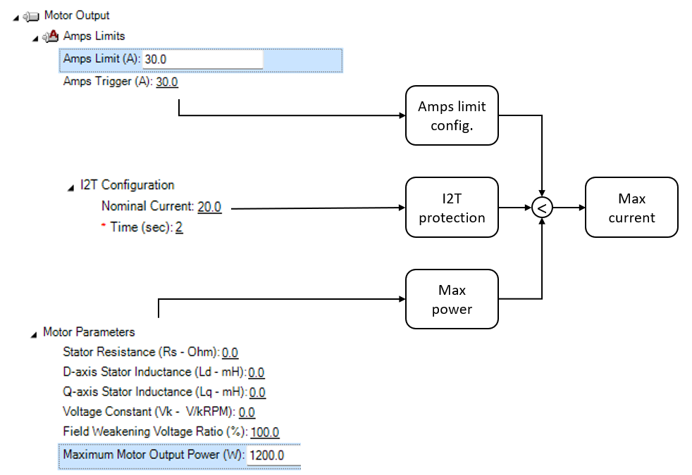The maximum Motor Output Power configuration sets the current limit threshold according to the following formula: