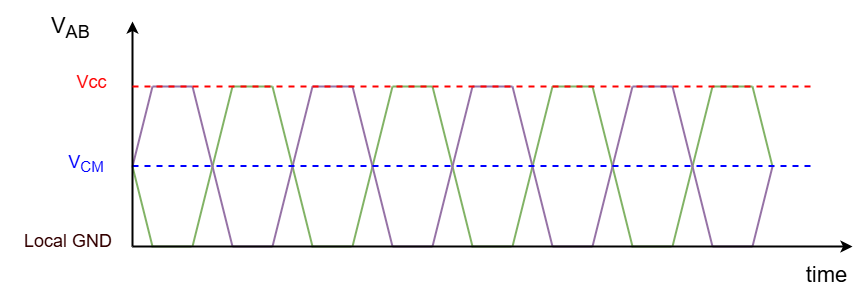 The resulting waveform can be modeled as a positive and negative differential voltage superimposed onto a common-mode offset voltage (VCM), which is typically close to Vcc/2.